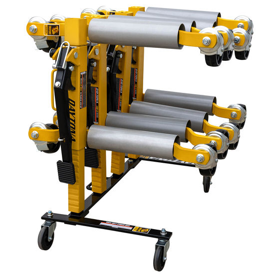 The DAYTONA™ 1300 lb. Capacity Self-Loading Positioning Wheel Dolly is designed for instant placement - no jack needed. The open-side lift rolls into place and fits vehicle wheels up to 34 in. H x 11 in. W. A built-in jack lifts individual wheel weight up to 1300 lb. The foot pedal ratchet system leaves your hands free for positioning and making safe adjustments. The self-loading wheel dolly comes with a convenient carry handle, smooth-rolling swivel casters, and polished twin rollers for secure tire support.